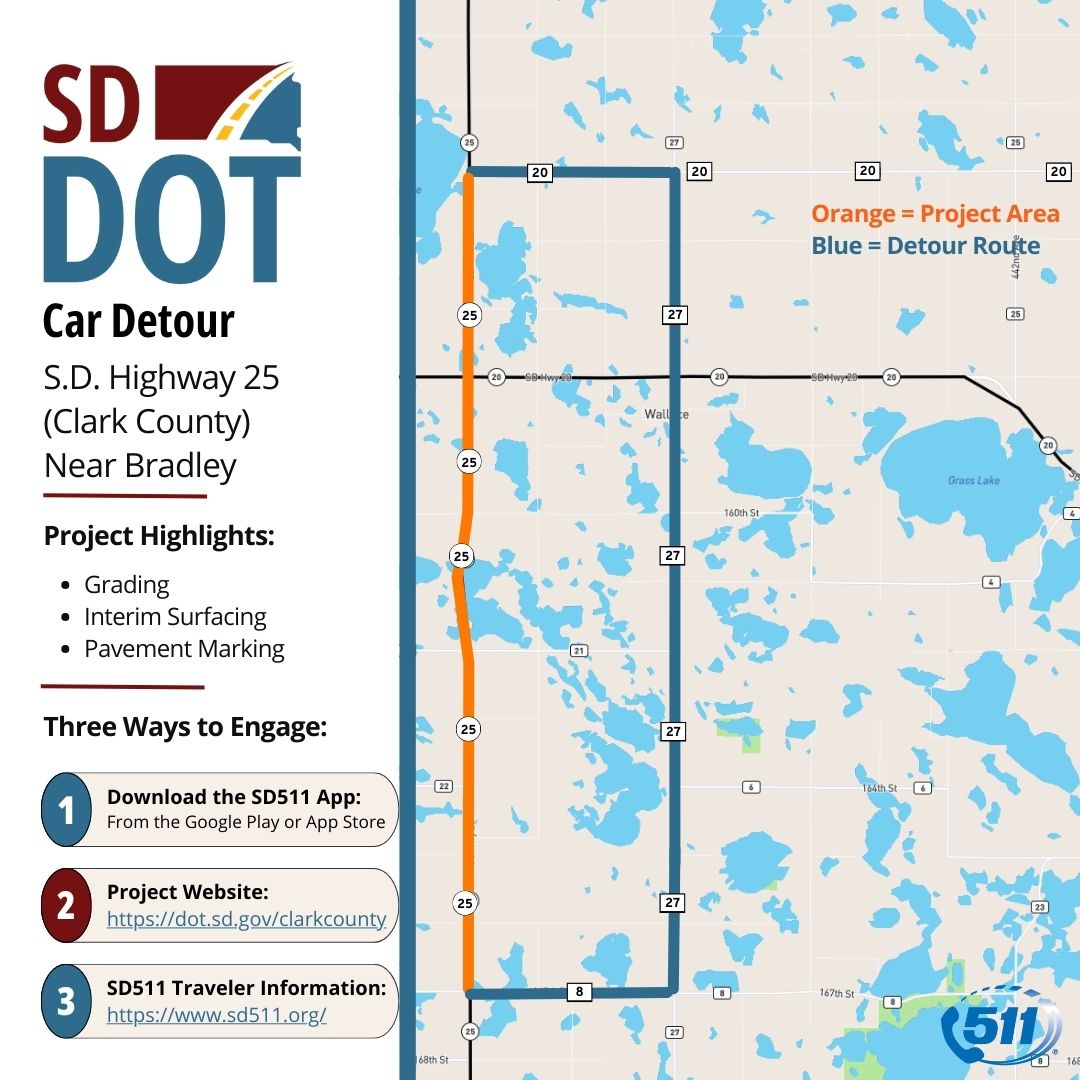 A passenger vehicle detour will also be provided using Highway 20, 437th Avenue (Codington County Road 27), and 155th Street.