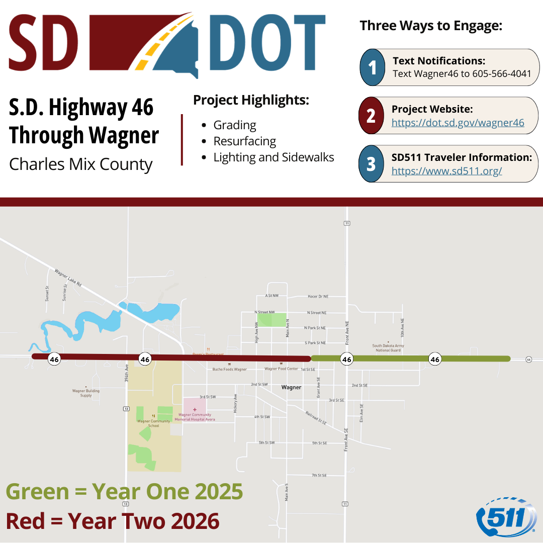 On Wednesday, March 18, 2026, construction work is scheduled to resume on S.D. Highway 46 through the town of Wagner. Work on phase two of the project includes rebuilding the roadway and storm sewer from Grant Avenue SE to the west end of the Wagner City limits. The City of Wagner will be conducting a simultaneous project to install city water and sanitary sewer. Permanent striping on the project is scheduled for 2027.