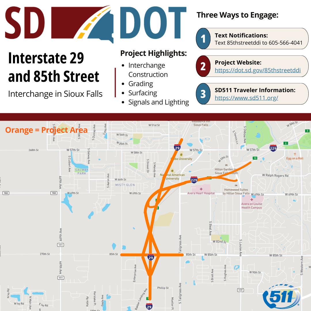 On Monday, April 27, 2026, a lane closure will be installed on the northbound median lane of Interstate 29 at 85th Street in Sioux Falls. Two lanes of I-29 northbound traffic will remain open to traffic. This lane closure will remain in place through November 2026. The project includes construction of a Diverging Diamond Interchange (DDI), structure development work, grading, concrete surfacing, curb and gutter, storm sewer, lighting, signals, permanent signing, and pavement marking.