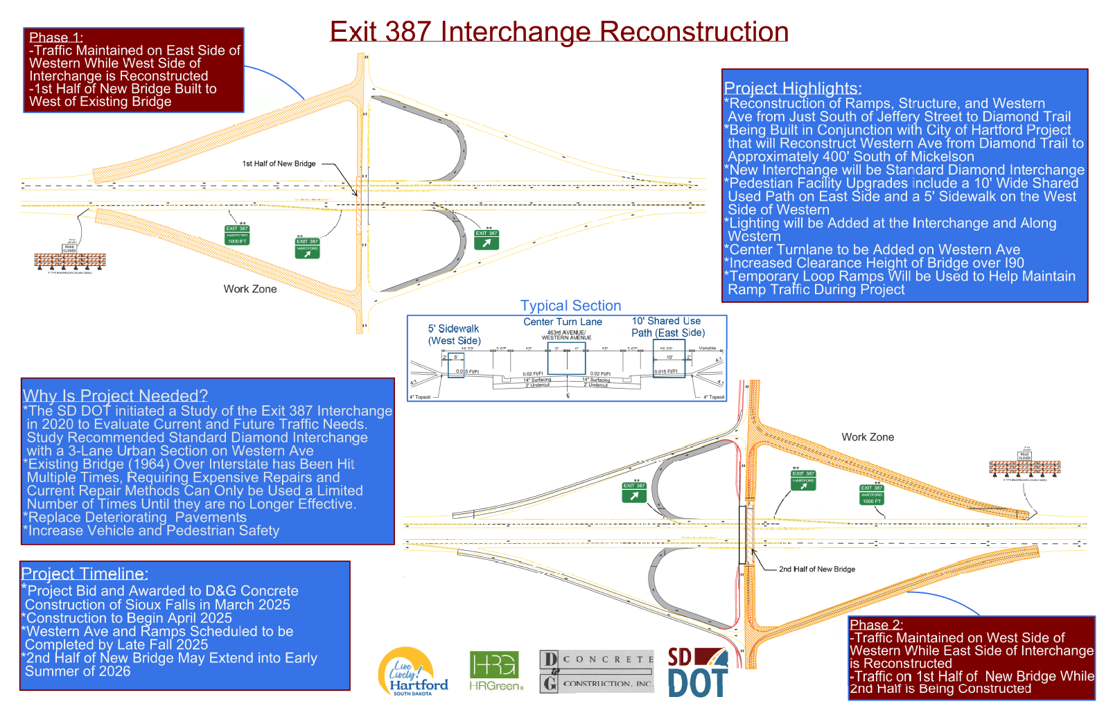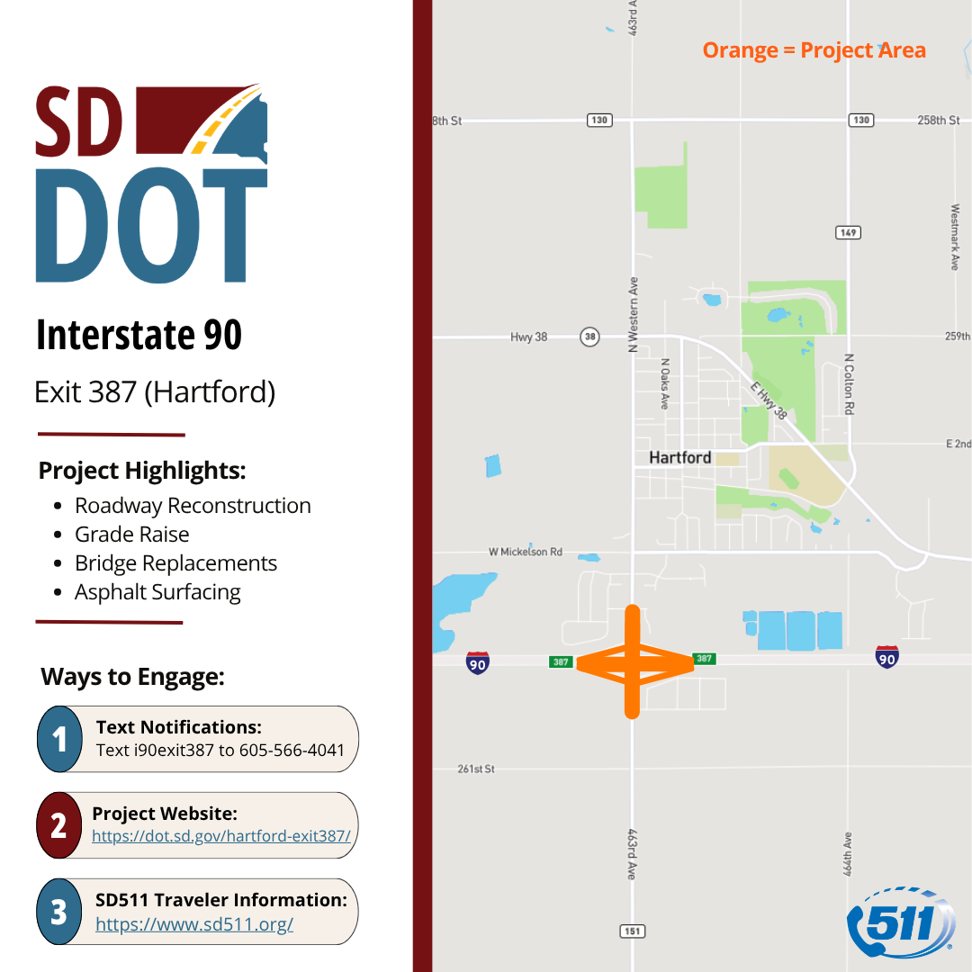 This project will include reconstructing the standard diamond interchange at exit 387 and replacing the structure over I-90. Western Avenue will be reconstructed as a three-lane roadway with a center left-turn lane, curb and gutter, sidewalk, and a shared use path. Additionally, the City of Hartford will have a project starting that extends the reconstruction of Western Avenue from Diamond Trail to the north of Mickelson Road. Motorists are asked to stay alert for workers, equipment, and slowed traffic through the work zone.