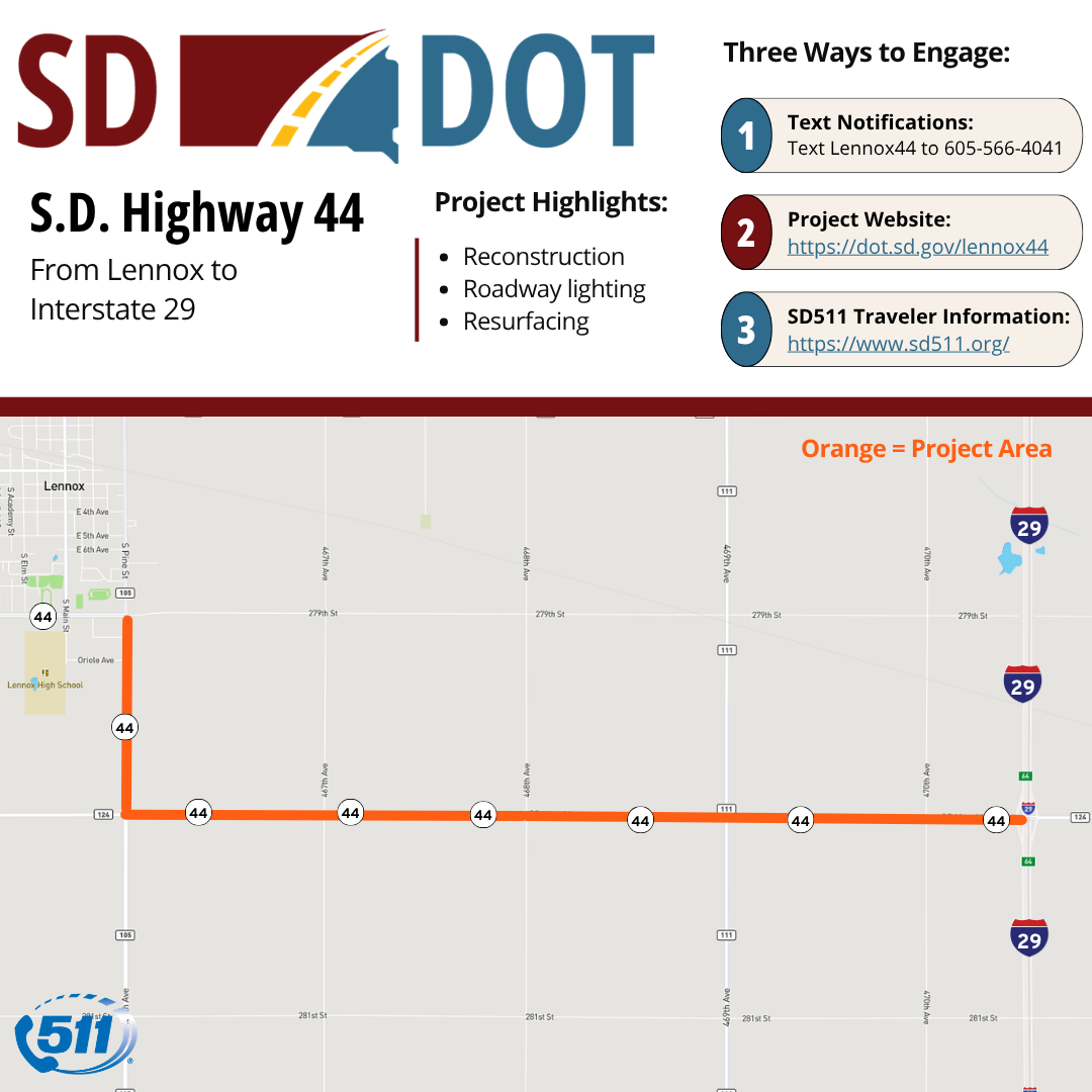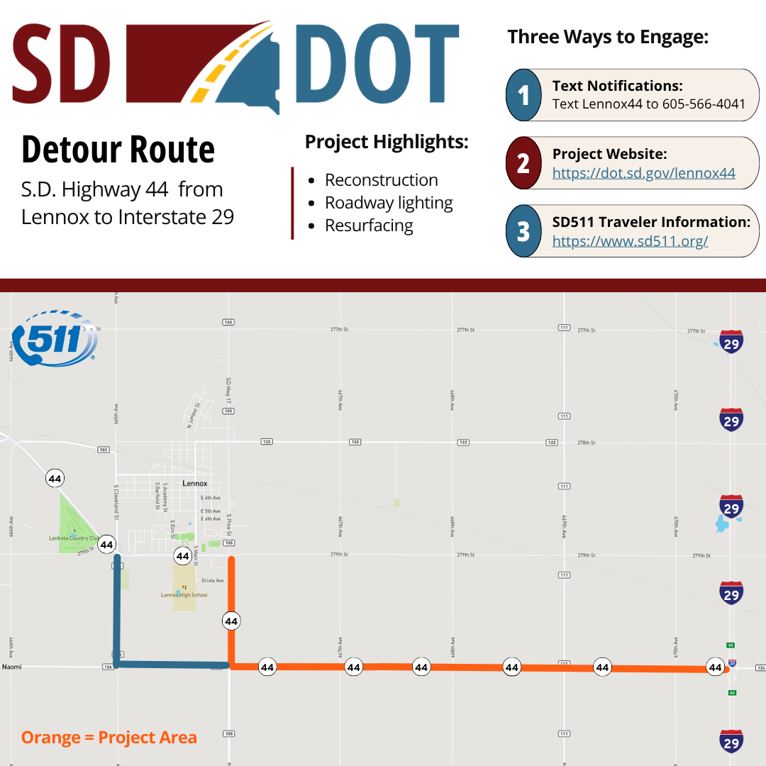 A signed detour route will be available using 465th Avenue on the west side of Lennox and 280th Street to travel east and west on Highway 44.