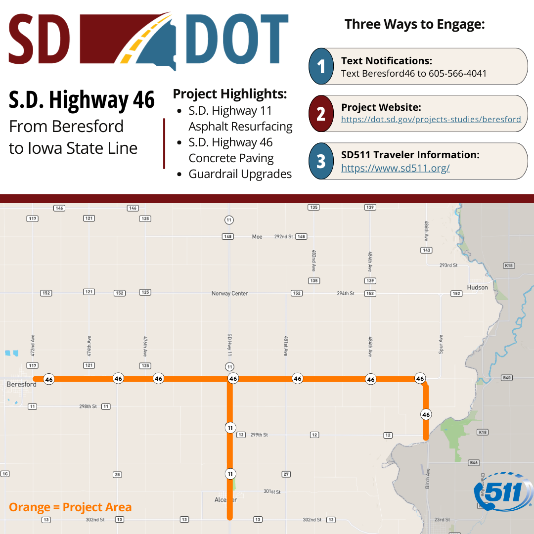 On Tuesday, April 7, 2026, S.D. Highway 46 from the east edge of the City of Beresford to 297th Street (Hudson Curve) is scheduled to close to complete the surfacing portion of the project. During the closure, motorists will be directed to the signed detour route on Interstate 29, Lincoln County Road 152, and Lincoln County Road 143.