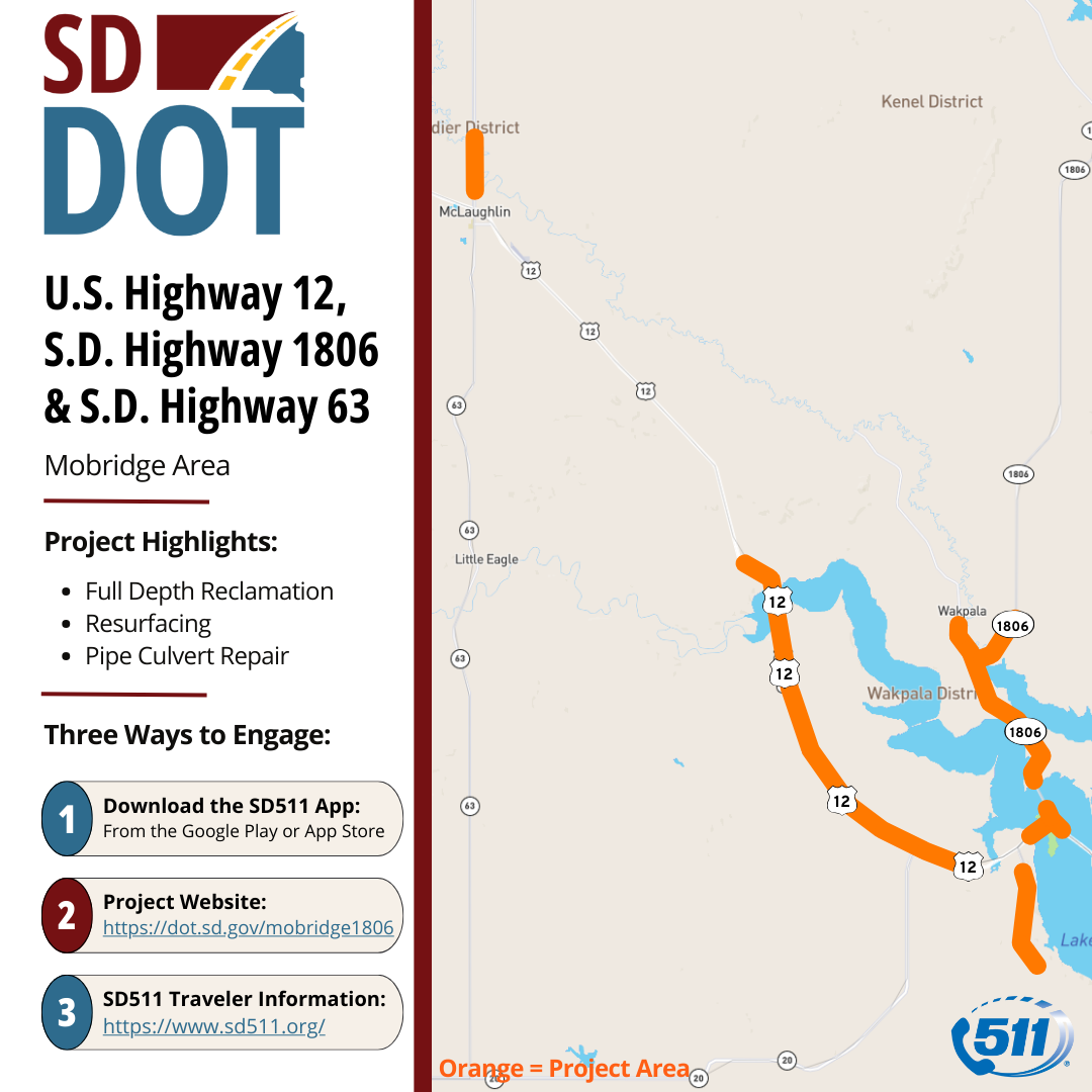 On Monday, April 13, 2026, a project is scheduled to begin on U.S. Highway 12 from Mobridge west approximately 15 miles and on S.D. Highway 1806 both north and south of Highway 12. The Highway 12 project will primarily involve pipe and guardrail corner improvements on the shoulders of the highway.