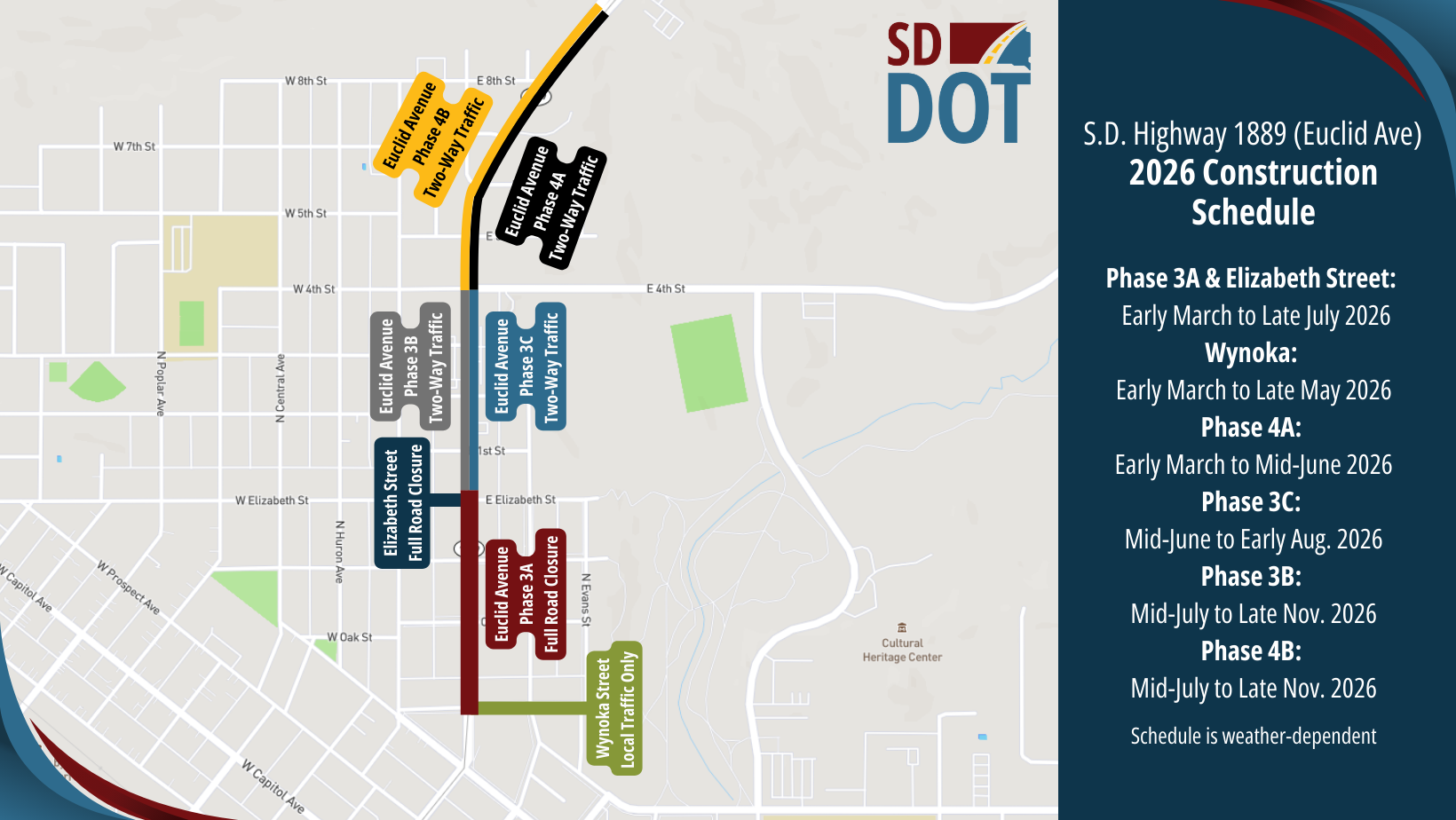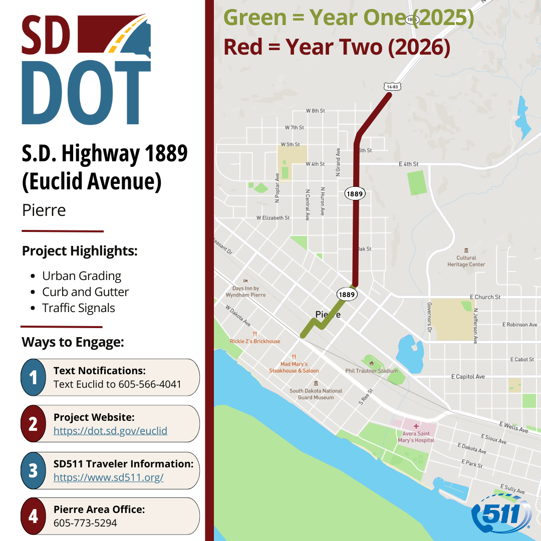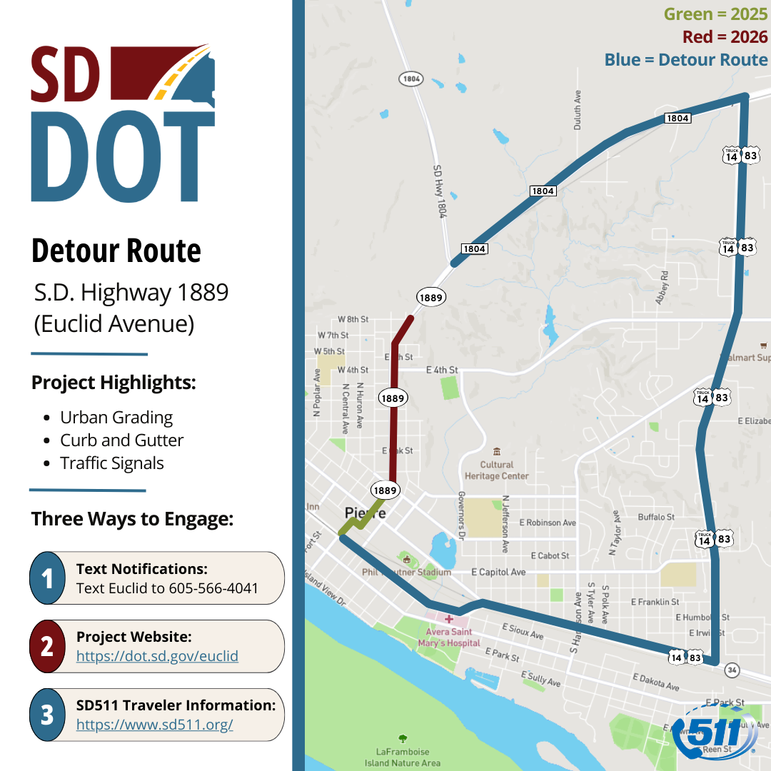 Work resumed Monday, March 2, 2026. A 10-foot width restriction is in place for segments with two-way traffic. A detour is in place from the U.S. Highway 14/S.D. Highway 1889 intersection at Sioux and Pierre streets to the S.D. Highway 1804/Highway 1889 intersection north of Pierre.