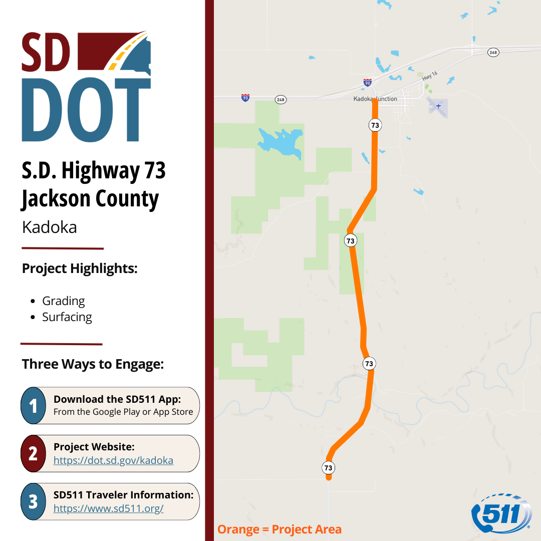 On Thursday, March 26, 2026, the South Dakota Department of Transportation (SDDOT) will be hosting a public informational meeting at 5:30 p.m. (MT) to share information as the multi-year reconstruction project resumes on S.D. Highway 73 south of White River to Kadoka. The informational meeting will be held at the City Auditorium Annex, located at 820 Chestnut St. in Kadoka. This meeting will provide information and answer questions for the public about the grading project on Highway 73.