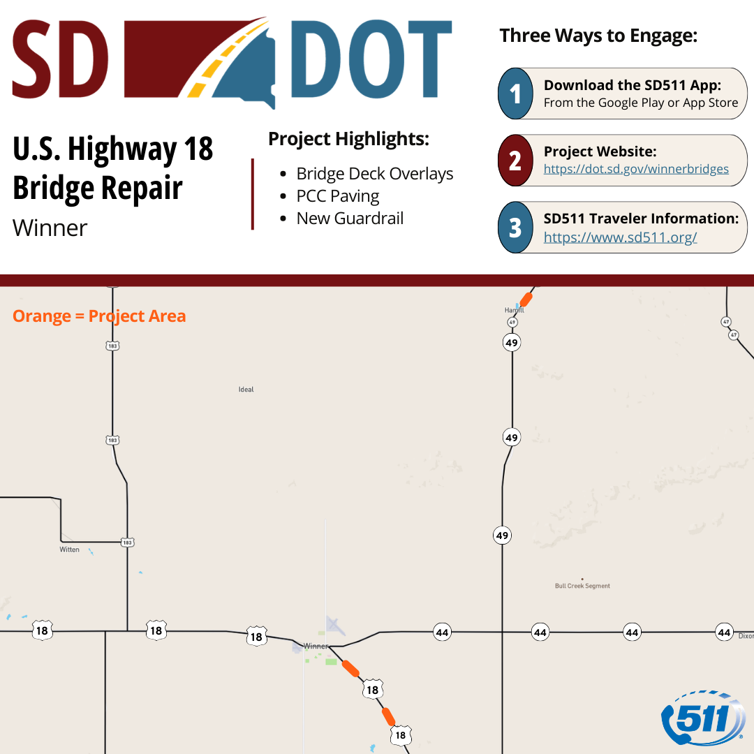 Work is expected to resume on April 6, 2026, at the bridges on U.S. Highway 18 between Winner and Colome. Traffic will be reduced to one lane across the bridges and will be controlled by stop sign.