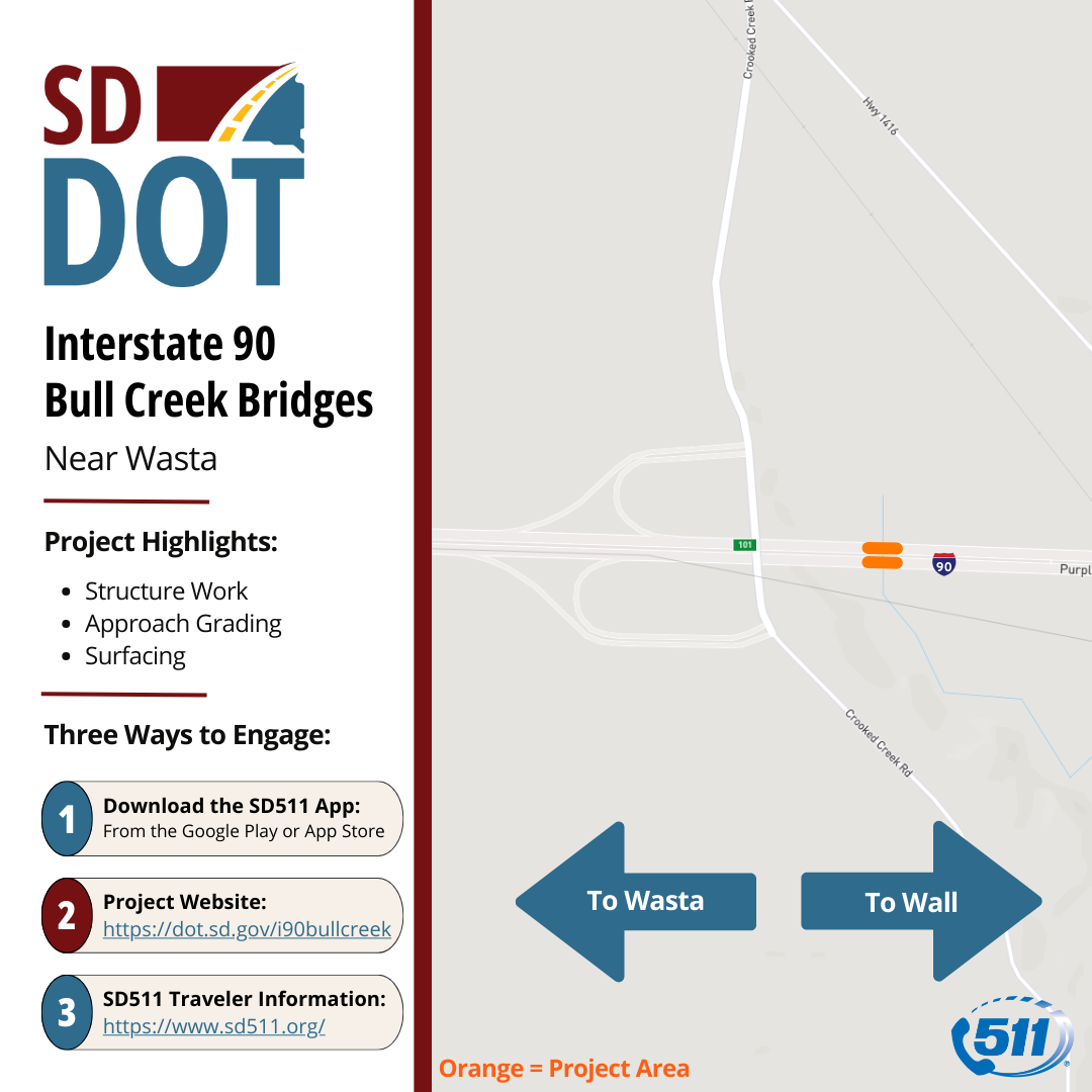 Beginning Monday, March 2, 2026, road work is scheduled to begin on Interstate 90, near exit 101 in Wasta. The work includes the demolition and replacement of the bridge in the eastbound lanes of I-90 over Bull Creek, including approach grading and new asphalt surfacing. This is the second phase of the project. The first phase entailed replacing the bridge in the westbound lanes, which was completed in November 2025.
