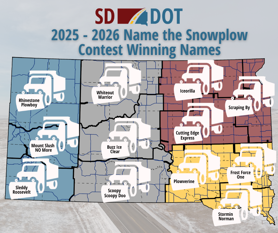 “While we cannot predict the winter weather, all of us can control how we prepare and respond,” said Transportation Secretary Joel Jundt. “The snowplow naming contest helps us build awareness about SDDOT’s winter maintenance operations and the many resources available to the traveling public.”