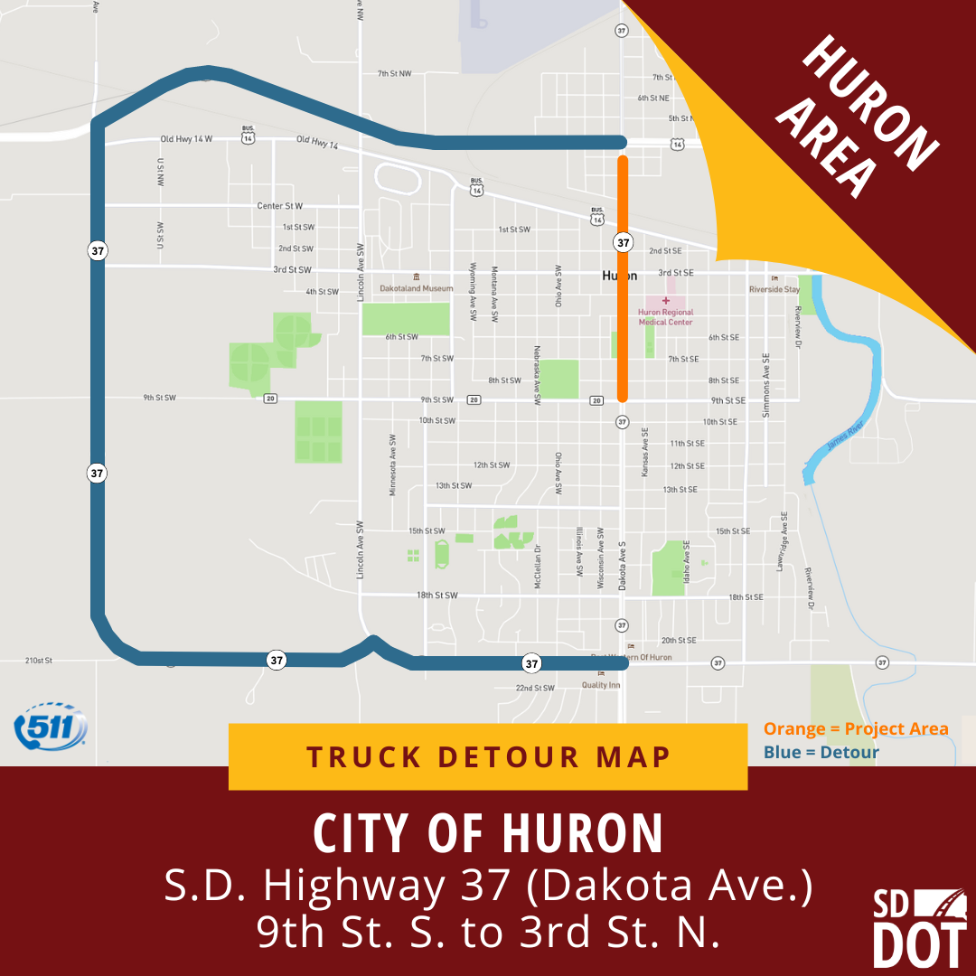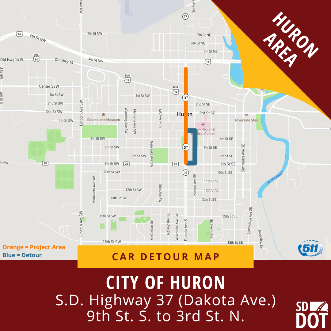 Oct. 15, 2025 – Nov. 15, 2025 Completed Work: All work on the southern and northern portions of Dakota Avenue (S.D. Highway 37) has been completed, and all lanes are open to traffic. This concludes construction activities within the City of Huron for the 2025 season.